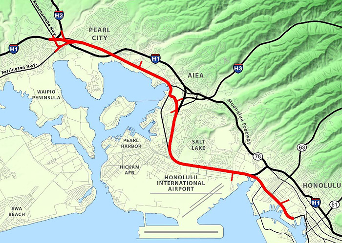The Honolulu reversible HOT (Managed) lanes proposal: The following images and video show the route, details of the exit/entrances, and an explanation of the link between the in-town termination of the HOT lanes and the link to the Hotel Street Transit Mall and the subsequent couplet linking to UH Manoa.