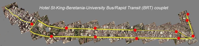 The Hotel Street/King/Beretania/University couplet: The rendering below shows at the left end in yellow the off ramp leading to the Mall, which at the end turns right onto Richards Street and thenn turns left onto King Street. The route then travels along King Street until University Avenue where it turns left. After stops in the University itself, the route returns down University.
