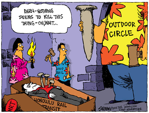 We rather liked this in the comments section of Borreca's column Top Ten Reasons The Great Pyramids Were Built Faster Than Rail 10. Surf's never up in Egypt 9. Egyptians benefited from Pyramid schemes of King TutenMadoff 8. They didn't have to go through Kalihi 7. No endless debate over the merits of elevated pyramids 6. All the "slaves" in Hawaii are already employed as public school teachers 5. Pyramid construction did not use Hawaii construction techniques such as the four-guys-watch-while-one-guy-works method 4. Everyone knows what a pyramid looks like from the back of a dollar bill, but nobody has any clue what Honolulu rail should look like. 3. As any Hawaii public high school graduate can tell you, it's easier to build things in Spain - or was that Italy? ok, maybe China? 2. Egyptians did not have to deal with the horrible tragedy of Zippy's upping prices and taking meatloaf off the rotating specials menu. 1. Pharaoh didn't blow all the money on useless "stimulus" programs - unlike a certain Punahou graduate