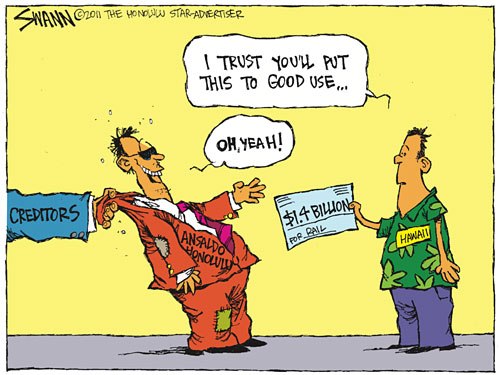 Star Advertiser editorial tells HART "Scrutiny of rail deal worth delay": The lead paragraph in today's main editorial is, "Honolulu's contract with a subsidiary of an Italian conglomerate to design, build and operate the city's rail transit project was scheduled to be signed next Friday, but a delay is needed to reassess what increasingly looks as shaky as the euro." That about says it all but the whole editorial is worth reading.