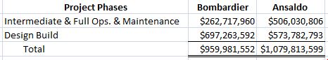Maybe there is another reason for the city accepting Ansaldo's high bid: Having heard no rational explanation for the City's accepting Ansaldo's high bid over Bombardier's lower bid for the Design/Build/Operate/Maintain (DBOM) contract, let us offer a speculative rationale. For the Design Build cost (construction costs), Ansaldo is clearly the winner with a bid that is $125 million less than Bombardier. However, for operating costs, Bombardier is the clear winner with a bid that is $240 million less (nearly half) than Ansaldo's. Overall, Bombardier's bid was $125 million less than Ansaldo's, but they lost the bid, which is a little strange. Bear in mind that the City's rail construction budget is limited to their using what they can get from the city's ½ percent addition to the GE Tax, any federal dollars, and any private funds they can raise; they cannot use any funds from the city's General Fund. On the other hand, they can use all they want for operating subsidies from the General Fund. It seems logical, given that the rail construction fund is held together with baling wire and duct tape, so to speak, that they would eagerly favor a bid that was low on constructions costs and high on operating subsidies.