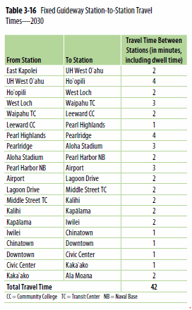 Let's review the City's projected travel time by rail from East Kapolei to Ala Moana Center: The Final EIS tells us in the table to the left that future rail commuters leaving East Kapolei would arrive at Ala Moana Center in 42 minutes. This is not quite credible given that the Final EIS table to the left shows that Iwilei to Ala Moana Center supposedly takes only six minutes even though it must load and unload passengers at five stations along the way (FEIS, Table 3-16). Further, the FEIS states, “the travel time, including access to station and waiting time for rail, between East Kapolei and Downtown Honolulu will be 55 minutes with the [rail] Project." (FEIS, Table 3-1) The 55 minutes travel time is a little more believable. Now let's review the current bus service from Kapolei proper, its Transit Center, to Ala Moana Center: Today’s scheduled time for the Route C Country Express service of TheBus from Kapolei Transit Center to Ala Moana Center during the rush hour varies from 44 to 58 minutes and averages 52 minutes. This you can see for yourself on the TheBus transit timetables. We have also discussed this with commuters who currently use this service and they find the service generally on time and reliable. Bear in mind that Kapolei proper is further from town than East Kapolei and Ala Moana Center is further along the route than Downtown. The FEIS also states that transit travel time from Kapolei to Downtown currently takes 86 minutes (FEIS, 1-9). Obviously, city planners are not coordinating their planning with TheBus administration.