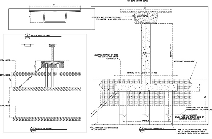 Another glimpse of construction-caused congestion: One of our major criticisms of the City is not what they tell you but what they leave out. For example, they tell you that rail will relieve traffic congestion, and that is true, but grossly misleading. What they don't tell you is the rest of the story. That is, rail will relieve traffic congestion (slightly) from what it might be if we did nothing, but congestion will still be worse than it is today. Similarly, they tell you that they would put in supporting pillars but they don't tell you what that entails. Here's an example of a pile cap arrangement that would have to be constructed anywhere the ground is not stable, such as anywhere makai of Queen Street, the original waterfront. Taking the average of the dimensions given in the engineering drawing below, it shows that they will drive three piles down to solid coral and then cap that with a concrete block that is 42.5' long x 11' wide x 5' thick. On top of that is placed an 8' diameter (same width as a city bus) by 42' high supporting pillar capped with the platform upon which the rails would be placed. Let's consider the implications of that. Along Nimitz Highway and Halekauwila Street they would dig holes 42.5' wide, say four lanes, and 11' long. That means the Halekauwila Street would have to be closed during construction since in most place the street is not that wide. Nimitz Highway might be able to sustain traffic operations for one lane in each direction — possibly. We must remember that while the hole may be 42.5' wide, additional space is needed all around it for construction crews and equipment to operate. Of course, if native Hawaiian bones are discovered it means that everything stops until all the legal issues are sorted out. Altogether this might have some implications for traffic congestion.