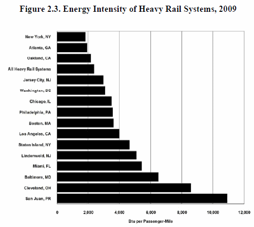 The 2011 Federal Transportation Energy Data Book is now out: The U.S. Department of Energy has issued the 30th edition of its Transportation Energy Data Book and tells us that the automobile is still more energy efficient than most rail lines. Among other things, it tells us that 3,538 Btus per passenger mile is now the average energy usage for automobiles. (British Thermal Units is the standard measurement of energy) (Source: Table 2.13). The Data Book warns us to be careful with averages. This is especially true for weighted averages where, for example, New York City, which has nearly 60 percent of the nation’s rail transit passenger boardings and is very energy efficient, has an overwhelming influence on the weighted average.