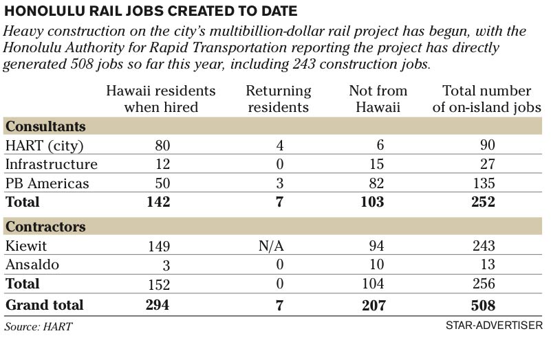 Are the local construction jobs really going to run into the thousands? The adjacent table is courtesy of a recent Hawaii Star-Advertiser article. It looks to us that HART has "generated" 152 local construction jobs out of the total of 508 jobs so far. Since we always parse the City's sentences we have to note the word "generated" as being different from the simple "hired." Does it mean they intend to hire or they have actually already hired? With the new transparency promised by Mr. Grabauskas we are sure that we will shortly be enlightened as to what it actually means. City transparency in the past has simply meant that we could see through all their attempts to mislead us.