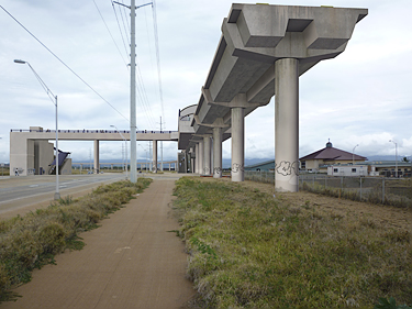 The elevated rail line to the right of the drawing depicts the provision of a secondary rail line, which is the "planned extensions" to UH and Waikiki to go over the structures along Kona Street that are part of Ala Moana Center. Note that it is a single line, which raises questions about the frequency of service to UH and Waikiki when there is only a single line to service both of them. This is a "straddle bent" support (see photo at our May 1 entry below) used when a center line supporting pillar is not practical; it uses smaller supporting pillars on each side with a cross beam between them. Also note the approximately 3½-foot high sound barriers on the outer edges of the rail line. These are to reduce the sound level of the train, a problem which up to now we were told did not exist. The space between the trains allows space for an emergency walkway for use when power failures occur. However, the walkway is not at the level of train egress and so one has to wonder how wheelchairs will be dealt with.