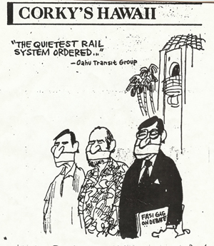In 1991 during the earlier fight over rail, the Waikiki Improvement Association, which is essentially a sort of Chamber of Commerce for Waikiki businesses, staged a debate between COST and the City (The Committee on Sensible Transit (COST) was an earlier incarnation of Honolulutraffic.com before the Internet came of age). Robert Behnke, a former Hawaii prominent businessman and traffic expert, and Cliff Slater represented COST and Sharon Greene, a still prominent transportation finance expert, Joe Magaldi, then City Transportation Director, and Amar Sappal, his deputy, represented the City. The debate took place before a crowd of about 200 in a Waikiki Hotel and it is generally agreed that COST wiped the floor with City. We know the City agreed with this assessment since the following day Mayor Frank Fasi issued a formal gag order preventing any City employee from ever appearing on a platform with COST members. That was twenty years ago and occasioned a great deal of comment in the press with one daily headlining in very large type, "GAG ORDER!" Corky drew his cartoon the next day after the gag order was put in place. The order even applied to events planned by UH and high school students. The three people represented in the cartoon are from the left Sappal, Magaldi, and we believe the then Corporation Counsel. To the best of our knowledge that gag order is still in place because two other local TV stations have tried to establish discussion panels with the City and Honolulutraffic,com and our partners with absolutely no luck. Because the City will not show up, and forbids it employees and its contractors to do so, these shows are usually cancelled. We are highly appreciative of Hawaii Public Television's incredible persistence in finding pro-rail people not in the control of the City to show up. We are also appreciative of Gary Okino's and Drew Astolfi's willingness to take the City's place in a discussion forum.