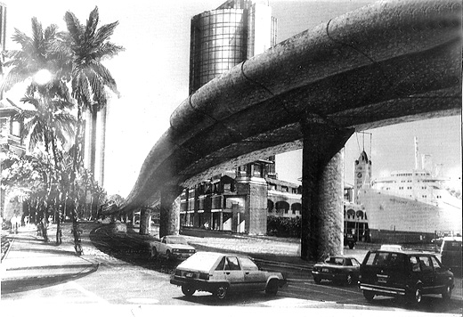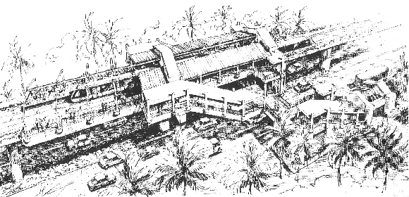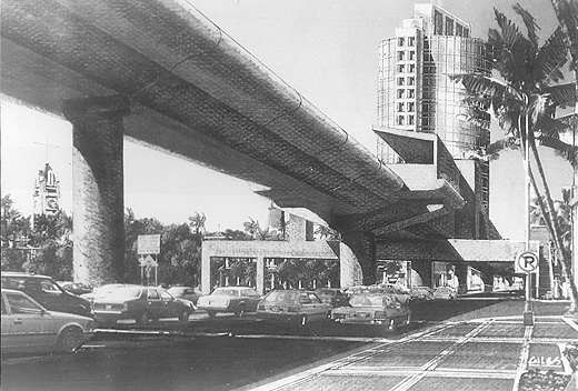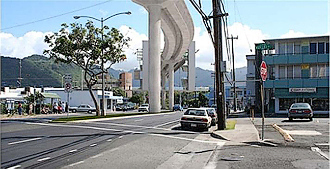 Our citizens need to understand some of the more environmentally degrading aspects of rail transit. Using the 1992 plans, which the City has said they would use and bring up to date, the size of the stations are 270 feet long, sprawl over both sides of every street they run on together escalators, elevators and stairs on each side of the street. Station heights vary from 50 to 75 feet above street level depending on the type of station. These two renderings above were produced in 1992 by the American Architects Association, Hawaii Chapter, which favored the rail line. The route for the line crosses the foot of Bishop Street, crosses to Halekauwila Street, up Ward Avenue to Waimunu crossing over to Kona Street at Kamakee Street. It goes along Kona on the mauka side of Ala Moana Center, up Atkinson and around the Convention Center onto Kapiolani until it turns up University Avenue and is at 65 feet above University as it goes over the H-1 freeway into UH where is stops at the Quarry station at the same altitude that it reaches in passing over H-1. Average decibel level is 75. The above photo/rendering produced by the City is the view from University Avenue just makai of King Street looking mauka. The Varsity Theater can been seen just to the left of the rail line. The above photo/rendering produced by the City is the view from underneath the Varsity Theater Station looking makai towards King Street with Kinko's to the right. This is a City rendering of the Aloha Tower rail station. It has a great deal of charm and provides a unique Hawaiian sense of place — they say. It will be admired by all those who believe in sustainability — of taxes.
